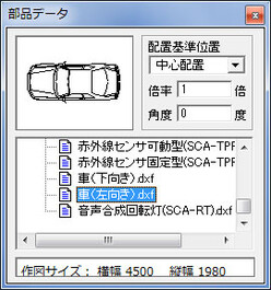 部品データリストを選びますと、図形がプレビューされます。 また、作図サイズも下部に表示されます。